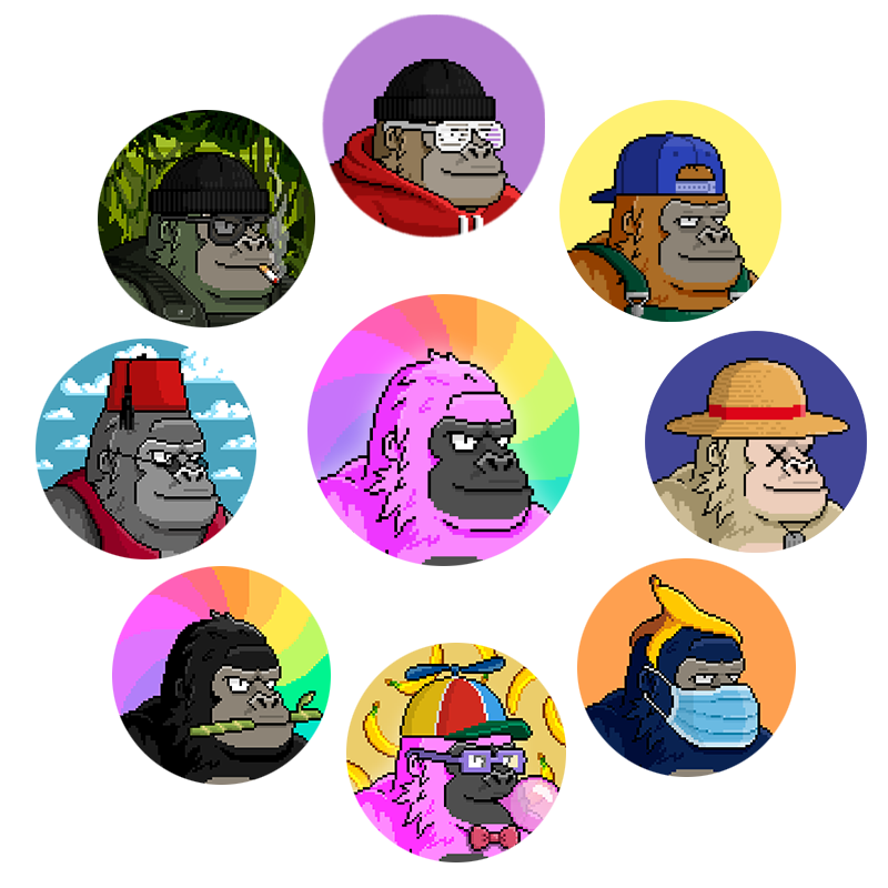 Every Genesis Gorilla is unique and programmatically generated from over 130+ possible attributes and traits like background, fur, clothes, mouth, head, earrings and eyes. Some gorillas will be rarer than others.